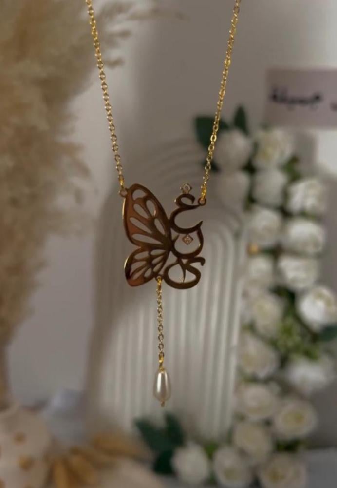 - سلسال ذهب على شكل فراشة ناعمة وأنيقة مدمجة مع اسمك أو اسم من تحب بطريقة فنية رائعة